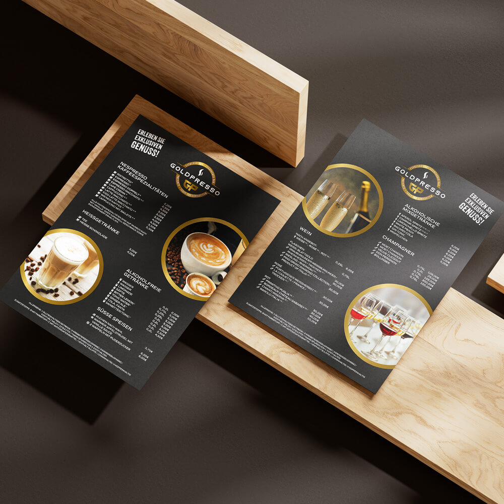 Für das gemütliche Café »GOLDPRESSO«, das den Beginn der Bad Orber Innenstadt markiert, durften wir sowohl die Speise- & Getränkekarte als auch die Website gestalten. 🥂☕