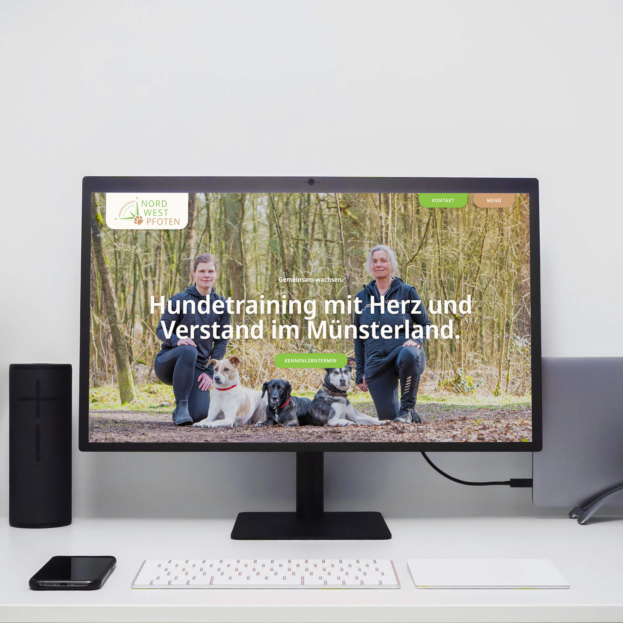 Die Hundeschule »Nordwestpfoten« bietet Hundetraining im Münsterland an. Wir durften für sie in gleich drei Belangen tätig werden. Mit viel Freude gestalteten wir für sie Logo, Visitenkarten und die Website.