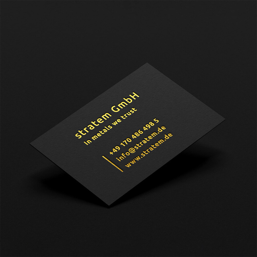 Auf der Visitenkarte erhalten die Goldbarren ihre natürliche Farbe. Die goldene Heißklebefolie hebt sich edel vom Schwarzkarton ab und verleiht neben dem Bildmotiv des Logos auch sämtlichen Schriftelementen eine elegante und hochwertige Wirkung.