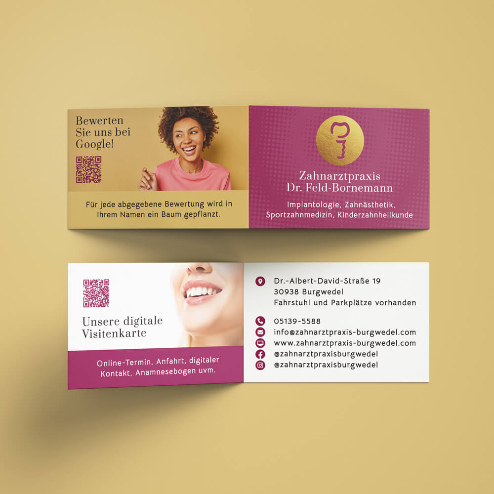 Die Zahnarztpraxis erhielt einen umfassenden Website-Relaunch sowie neue Visitenkarten, die das moderne Erscheinungsbild konsequent aufgreifen. Auf der Website wurden veraltete Inhalte entfernt und durch informative Blogs sowie neue Servicebereiche ersetzt. Ein stets präsenter Button für Online-Termine erleichtert die Terminbuchung enorm. Das Design wirkt insgesamt eleganter und zugleich frischer, um verschiedene Altersgruppen optimal anzusprechen. Die Visitenkarten greifen diesen Ansatz auf: Sie bieten viel Platz für Informationen, verweisen über QR-Codes direkt auf die digitale Visitenkarte und fordern zugleich charmant zu einer Google-Bewertung auf.